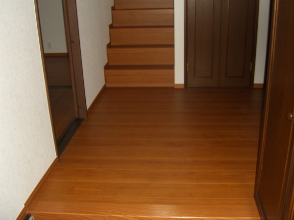 玄関廊下、階段も6mmフローリング上張りです。框もリフォーム框を使っております、